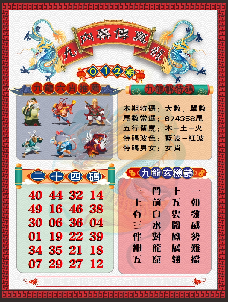 | 001期 | 龙羊猪 | 鼠马 | 蛇 |